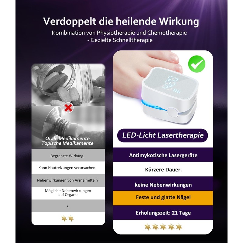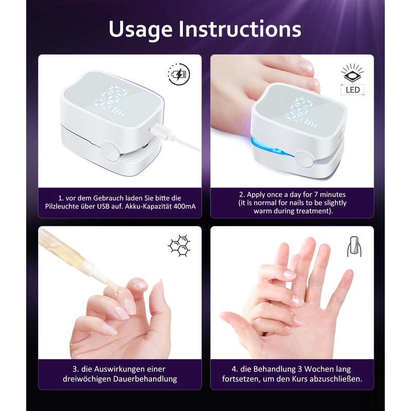 - 3 blue 1 infrared strongest therapy: the device uses a combination of three medical 500 nm blue light (repair) and a powerful 940 nm infrared light (sterilisation) thanks to laser therapy technology, which can effectively penetrate the nails, repair damaged cells and effectively destroy fungi. The wavelengths of the lasers of the device are constantly tested to treat the grey