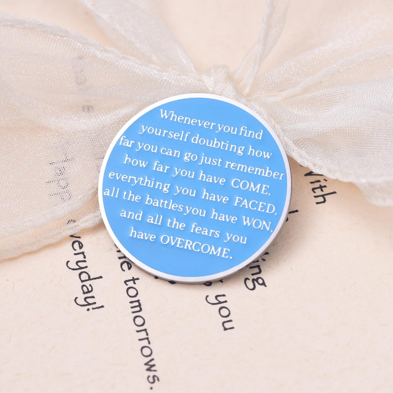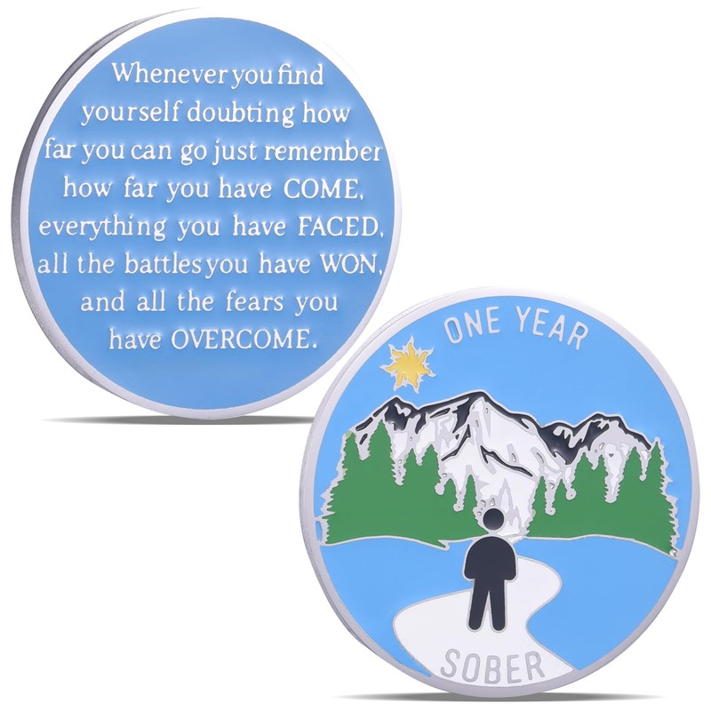 - Unique Design: 1 Year Sober AA coins and medallions front engraved: one year sober+ mountains, woods, sun, silhouettes, road patterns. The back engraved: Whenever you find yourself doubting how far you can go just remember how far have come, everything you have FACED, all the battles you have WON, AND ALL THE FEARS YOU HAVE OVERCOME.