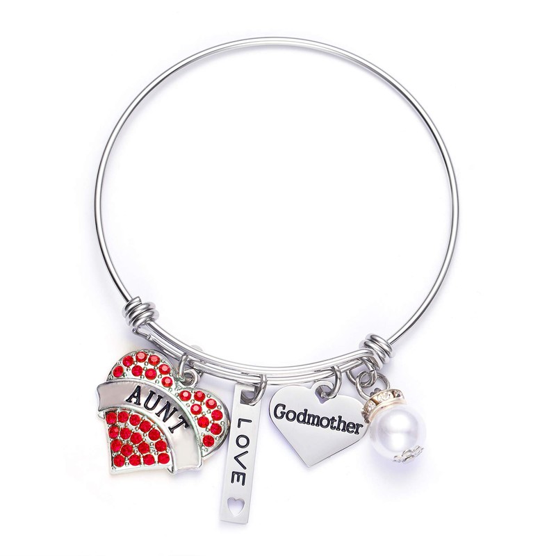 • Stainless steel adjustable bangle bracelet with Rhinestone Aunt Charm, Godmother Heart Charm, and Love Bar charm.