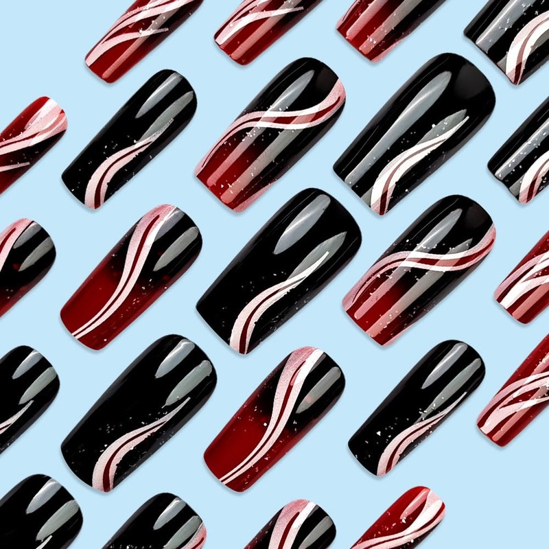 LPOODDNU Medium Square Press on Nails - Gradient Black Red Fake Nails with Fr...