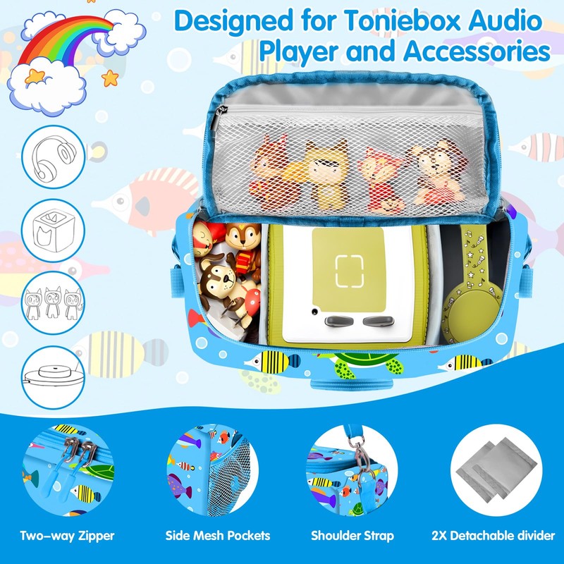 The portable travel case is compatible with Toniebox Audio Player Starter Set and Toniebox Figures.