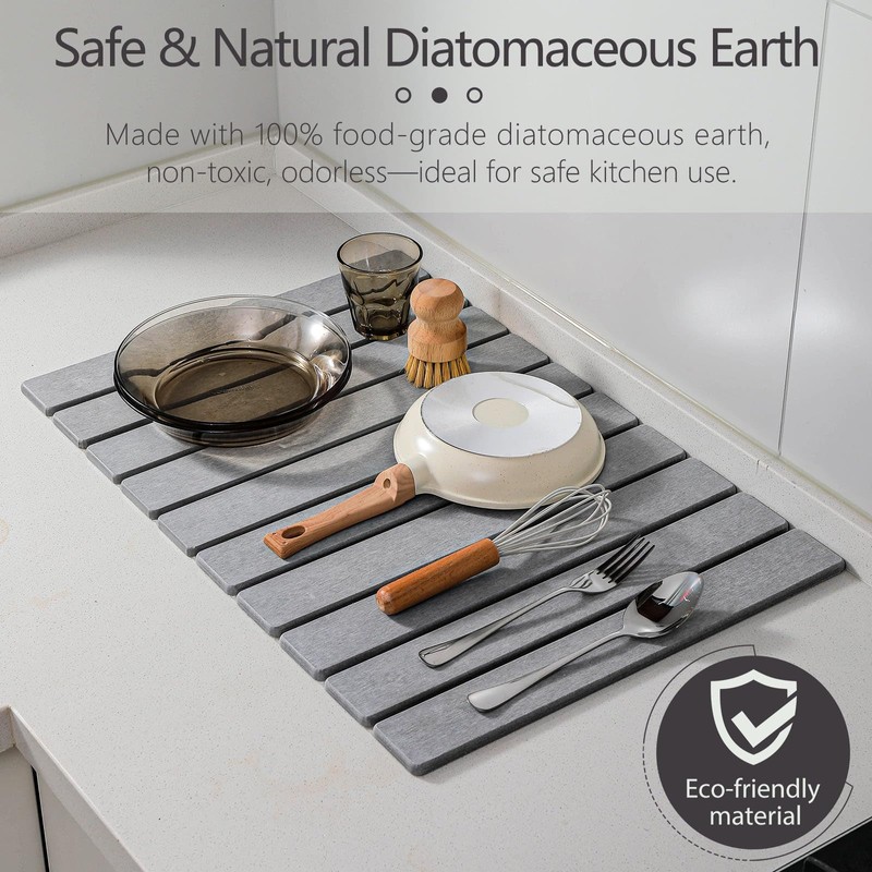 - 【Food-Grade Material】Our stone dish drying mat for kitchen counter is made of premium diatomaceous earth, a natural, eco-friendly material; non-toxic, odorless, and durable, making it the first choice for home kitchens