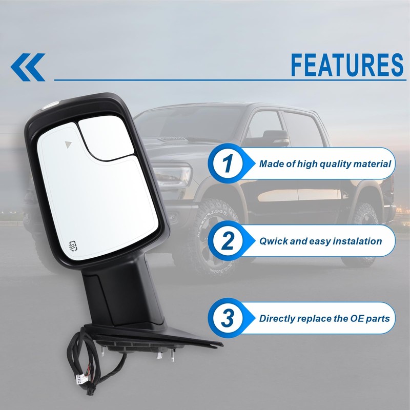 Lqito Left Driver Side Mirror Compatible With 2019-2025 Ram 1500 With Power Folding Power Glass Heated Turn Signal Puddle Lights Temperature Sensor Blind Spot Matte Black Replace #68462771AB(15Pins)
