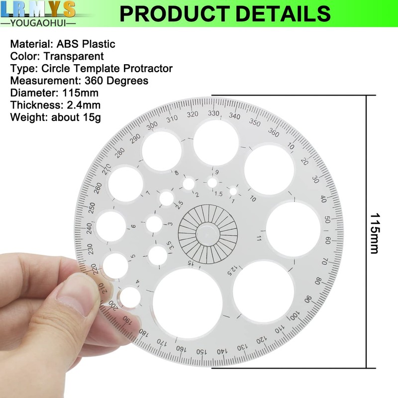 - 【PRODUCT DETAILS】- Material: ABS Plastic ; Color: Transparent; Type: Circle Template Protractor; Measurement: 360 Degrees; Diameter: 115mm; Thickness: 2.4mm; Weight: about 15g.