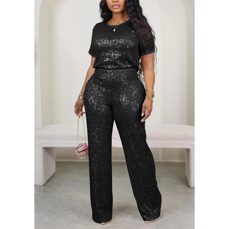 LROSEY Women's Sequin Short Sleeve Outfits Rompers Plus Size Top Pants Glitter Concert Suit (Black, 3XL)