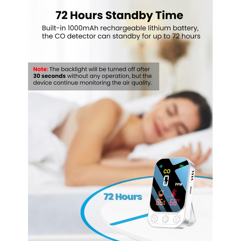 - 72 Hours Standby Time: LSENLTY carbon monoxide detectors' standby time can reach 72 hours. When the device is not operating, it will auto-turn off after 30 seconds.