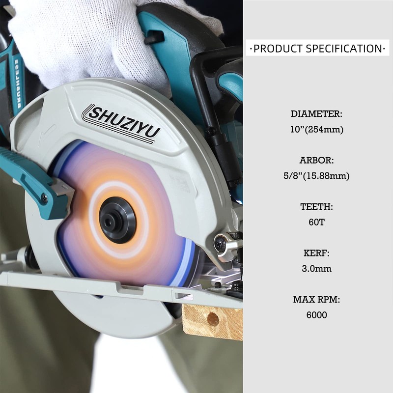 - ①: Size: Diameter 10" (254mm). Arbor 5/8" with diamond washer, Max Speed RPM 6000, Kerf 3.0mm, 60T ATB Tooth.
