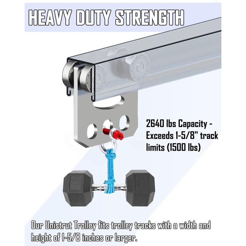- HEAVY-DUTY LOAD CAPACITY: The Unistrut trolley supports a safe working load of 2,640 lbs and has a breaking strength of up to 5,000 lbs, significantly surpassing the 1,500 lbs limit of standard 1-5/8 inch trolley tracks, ensuring unmatched safety for industrial applications