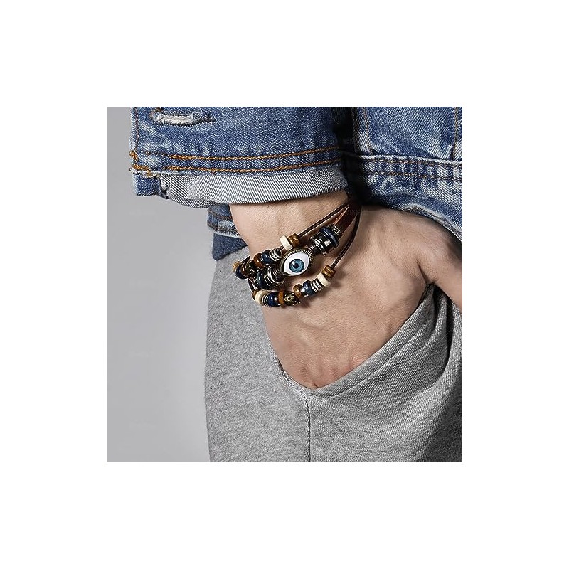 LSxAB Women Mens Evil Eye Leather Wrap Bracelet Multi-Layer Stackable Wristband Braided Adjustable Bracelets