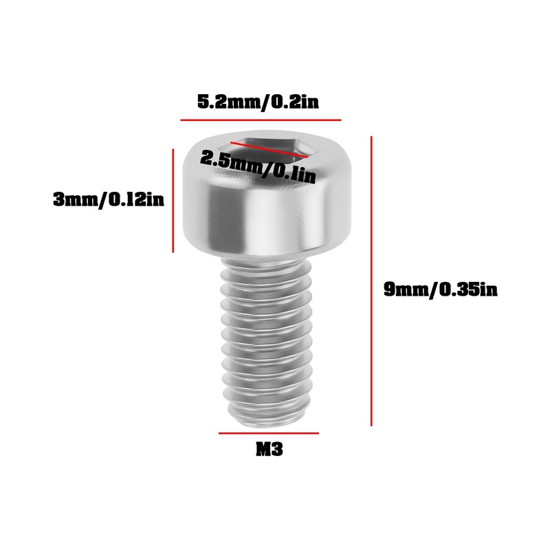 - Thread diameter: approx. 3 mm. Total length: approx. 9 mm, hex hole: 2.5 mm.