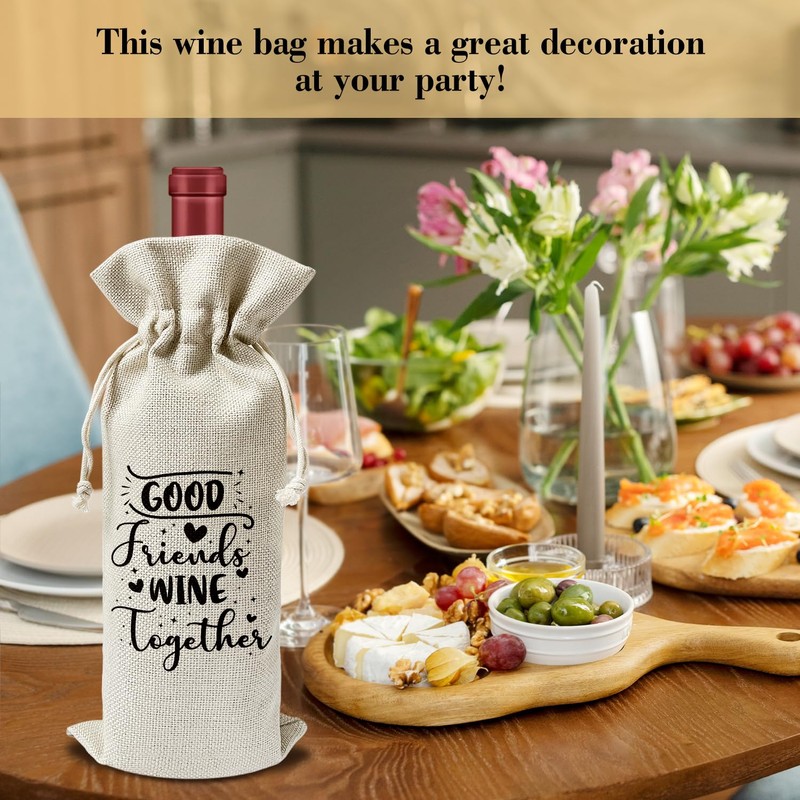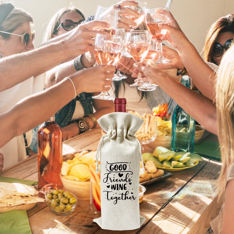 ltazhyi Good Friends Wine Together Linen Wine Bags Gift, Drawstring Wine Bottles Bags Gift for Women Men Her Him Friend Bestie, 1 Pack Reusable Burlap Wine Bag - 08