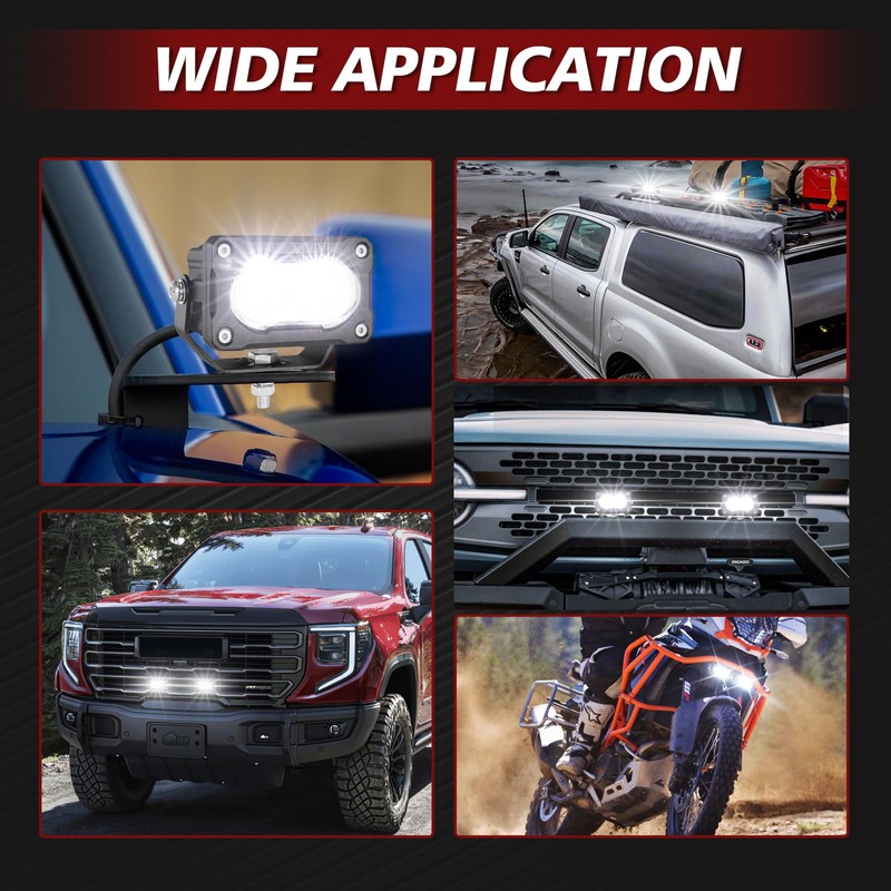 • WIDE APPLICATION - 3" LED off road lights fit for DC 12-24V vehicles and devices, like truck, utv, atv, motorcycle, Kawasaki, Yamaha, suv, boat, marine, pickup, 4x4, tractor etc. Can be mounted at OEM fog light position, bull bar, A pillar, ditch, roof, bumper and so on. They work perfectly as fog lamps, driving lights, headlights, backup lights and anything you can imagine.
