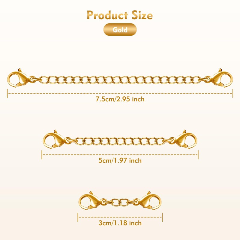 - PACKAGE CONTENT: You will receive 3 gold necklace extenders, 3cm/1.18 inches, 5cm/1.97 inches, 7.5cm/2.95 inches, one for each size. Different sizes can meet your different needs and can be used as extension chains for different jewelry, such as necklaces, bracelets, or anklets.