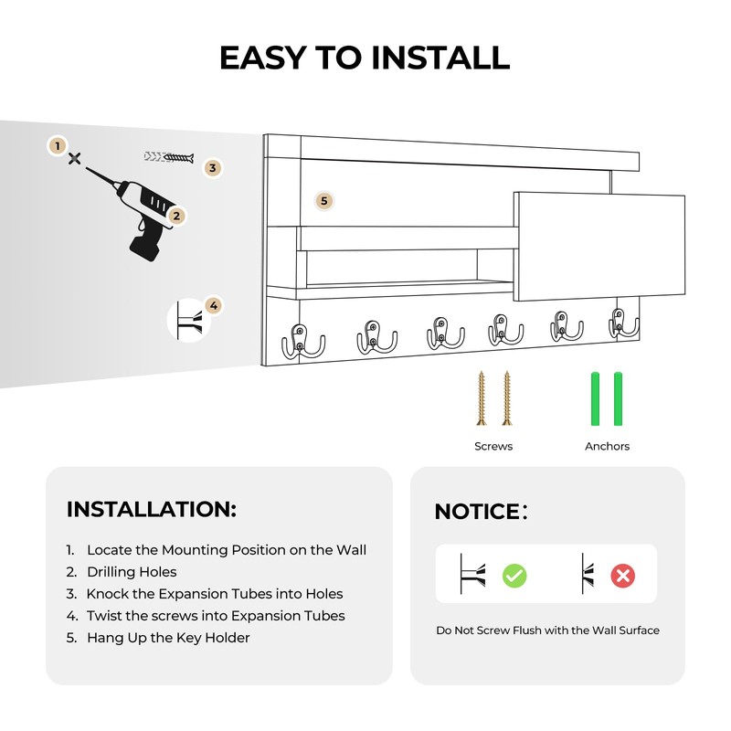 • Effortless Installation: This wooden key holder with shelf comes pre-assembled and includes two screws and expansion tubes. Just mark the hole positions using a wood ruler, secure the screws into the wall, and easily mount the mail holder.