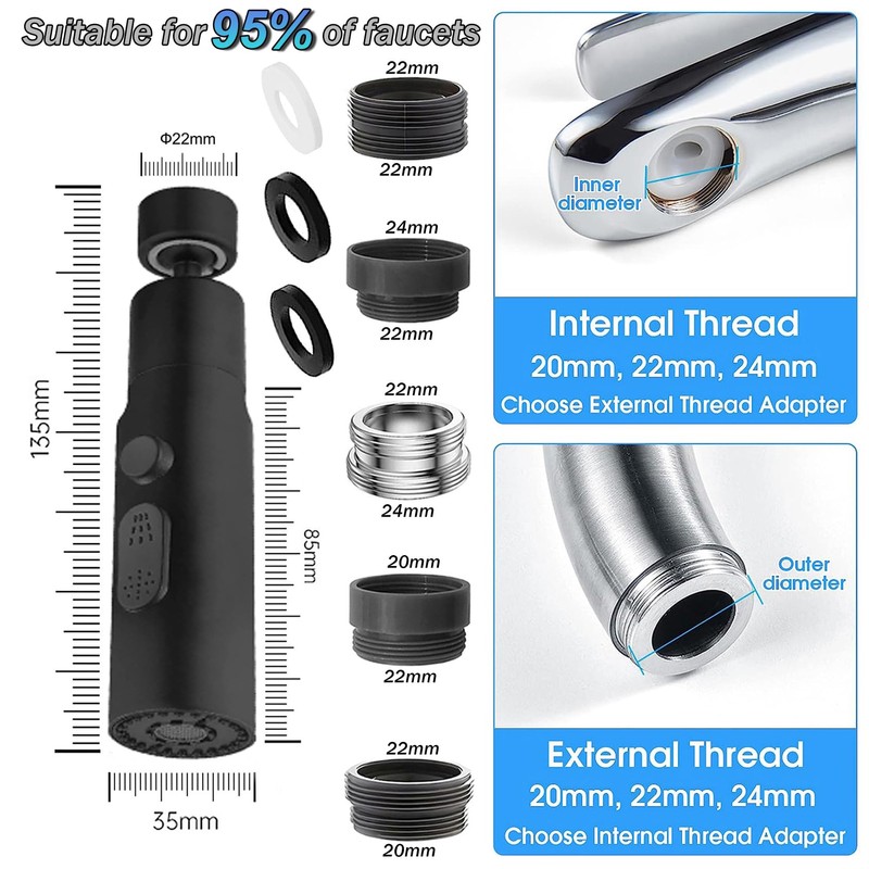 • ?? Einfache InstallationDer Wasserhahn Aufsatz ist mit 5 x Adapter und 3 x Dichtring, der fr herk?mmliche Wasserh?hne auf dem 95%Markt geeignet ist:M22-FM20, M22-M20, M22-M22, M22-FM24, M22-M24 (Geeigneter Typ: Wasserhahn mit Innengewinde 20mm, 22mm, 24mm und Wasserhahn mit Au?engewinde 20mm,22mm,24mm).Bitte berprfen Sie Ihren Gewindebohrertyp und -durchmesser und w?hlen Sie dann den entsprechenden Adapter installieren