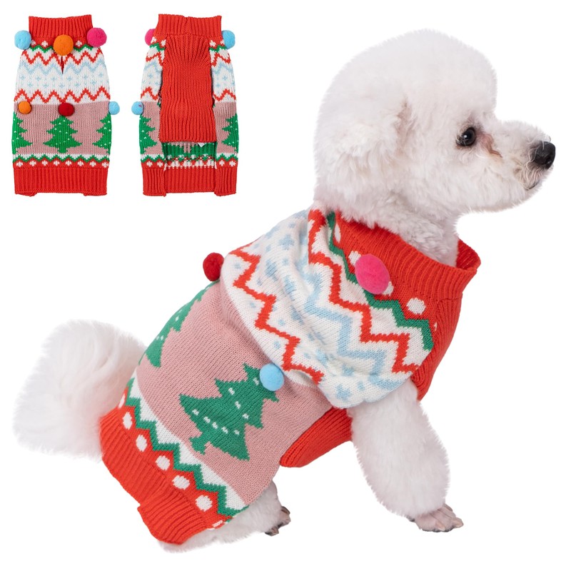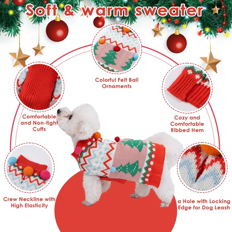 - 【🎁 Design】 :The bold, festive design features colorful pom-poms that pop with personality, while the bright red and pink base is adorned with cheerful Christmas trees and zigzag patterns. Colorful balls are a favorite toy for dogs, and this colorful ball sweater is suitable for your beloved pet
