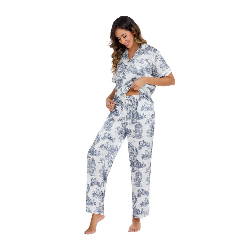 LUBOT Silk Pajamas for Women Satin Pajama Sets Printed PJ 2 Piece Short Sleeve Long Pants Soft Button Down Loungewear Sleepwear (White Scenery,L)