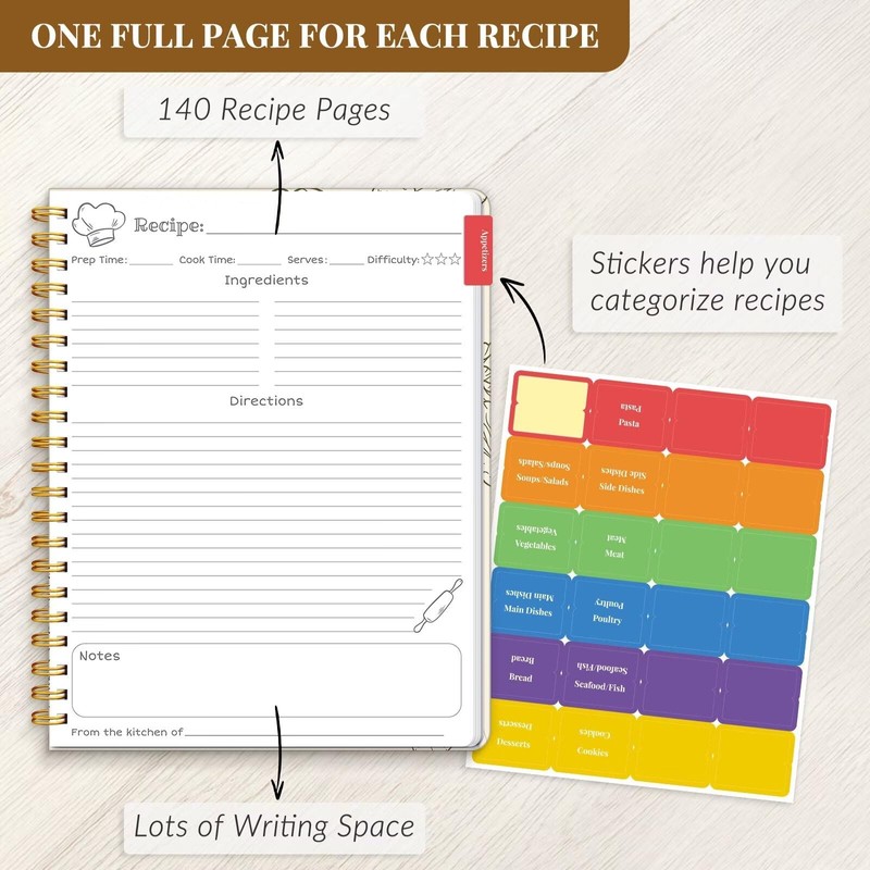 - Make Your Own Cookbook - 8.5" x 11" spiral recipe book containing 120 blank letter size pages, comes with 1 sheet of colorful stickers for categories, perfect for writing down your own recipes and organizing them in one place.