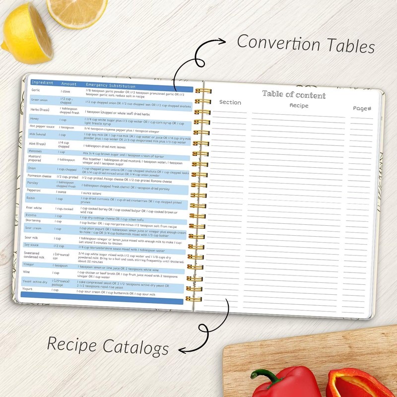 - Practical Design - 4 pages of conversion charts will show you everything you'll ever need to know in kitchen. The content tables will help organize your personal favorite recipes. A back pocket is designed for loose items.