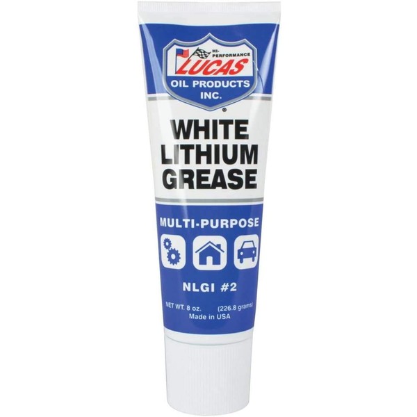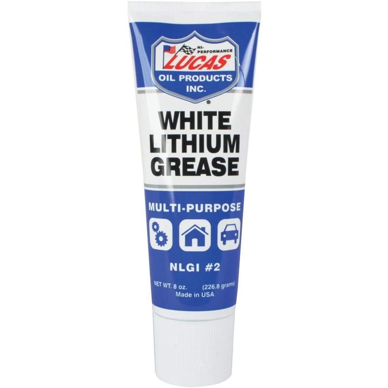 Lucas Oil 10533 Multi Purpose Grease; Slider Grease; White; Single; 8 Ounce Tube Lucas White Lithium Grease is a Multi-Purpose high quality NLGI number 2 formulation. White and creamy in appearance, the White Lithium Grease resist extreme pressure properties and is recommended for everything from household applications, to a variety of automotive uses including chassis, trucks, tractors, and contractor equipment.