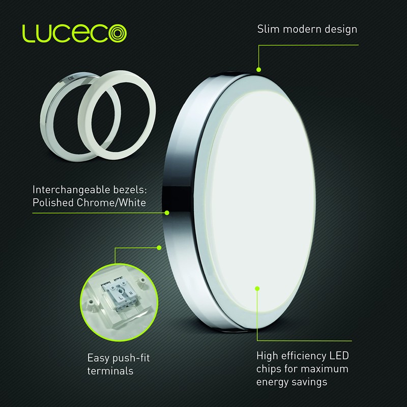 - RELAX AND ILLUMINATE YOUR HOME OR WORKSPACE WITH FLAWLESS ENERGY EFFICIENT COLOUR CHANGE LIGHTING: From Luceco, with the decorative indoor bulkhead supplied with both white and chrome interchangeable bezels