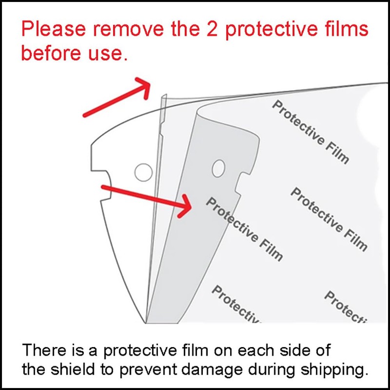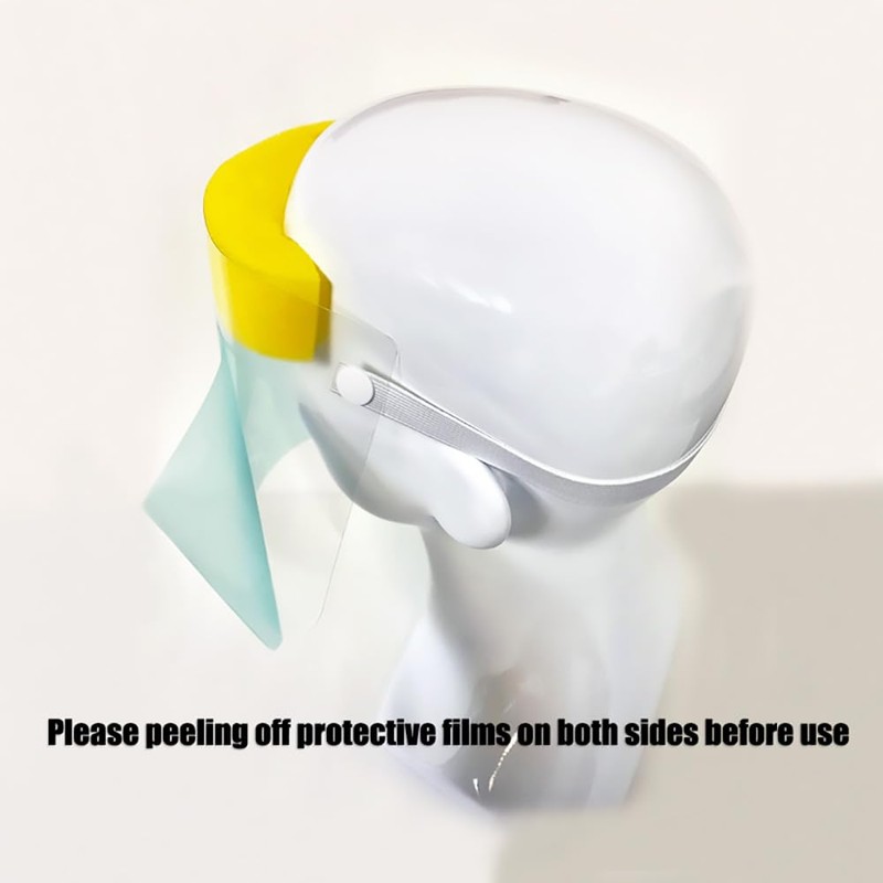 • Our clear protective full-face shields made with ultra-clear visor protected by protective film on both sides. Please peeling off both layers of the protective film before use.