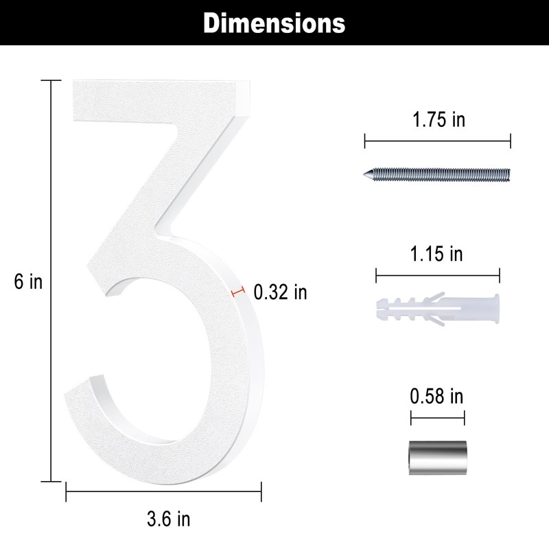 LUCK HOUSE 6 Inch Modern House Numbers for Outside, White Floating Home Address Numbers for House, Easy Installation with Self Adhesive or Screws (3)