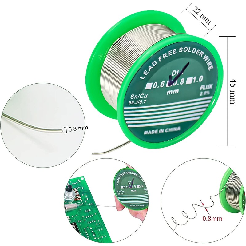 - Weight and diameter: the diameter of this lead-free solder wire is 0.8mm; Sn 99.3% -Cu 0.7%; Flux content: 2.2%.Weight:20g, welding wire adopts a small design.