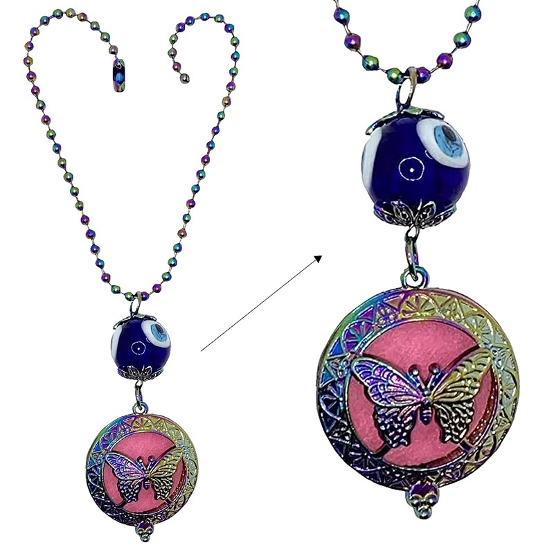 - Cerradura difusora decorativa: este difusor de aceite esencial para coche está hecho con un elegante diseño de collar de mariposa que traerá un poco de felicidad pura a tu vida. Este llavero adorno cuenta con una piedra contra el mal de ojo para protección. Es un pequeño difusor que marca una gran diferencia. ¡Es como joyas para tu coche!