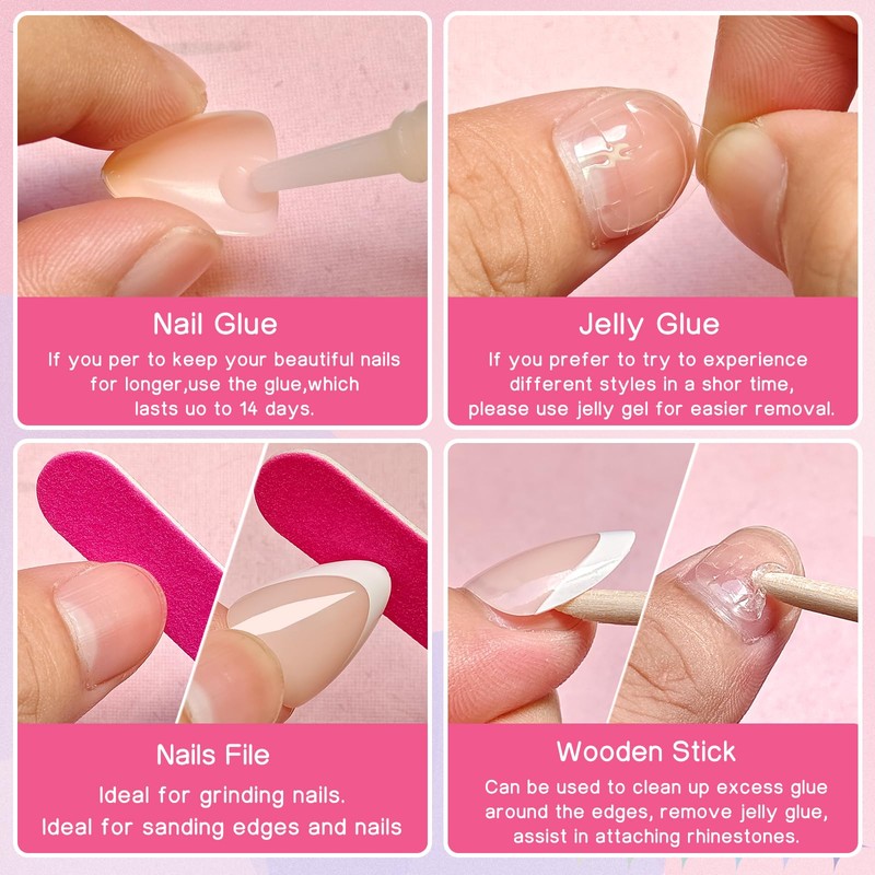 - Easy to Apply and Remove: French fake nails with glue save time and skip the salon! White french tips square press-on nails come with glue and file tools that you need for a quick, mess-free at home application. Press on square nails with glue and tabs allows you choose between adhesive tabs for temporary wear or nail glue for longer-lasting results. French tips nails press ons nails with tabs is safe and easy to remove, leaving your natural nails undamaged.