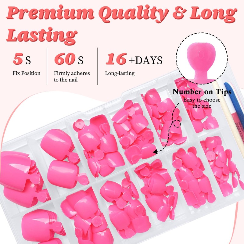 - Hot pink press on toenails kit: Fake toe nail press ons set come with 168pc hot pink toe nail tips in 12 different sizes, 5 sheets adhesive tabs, 1tube nail glue, 1pcs nail file and 1pc nail stick. Toenail press nail kit with nail glue and basic nail tools to manicure,enough quantity toe press on nails short square shape with multiple sizes for kids, teen girls and women. Press on nails for toe are prefect fake toenails kit for you to DIY quick at home pedicure with your family and friends.