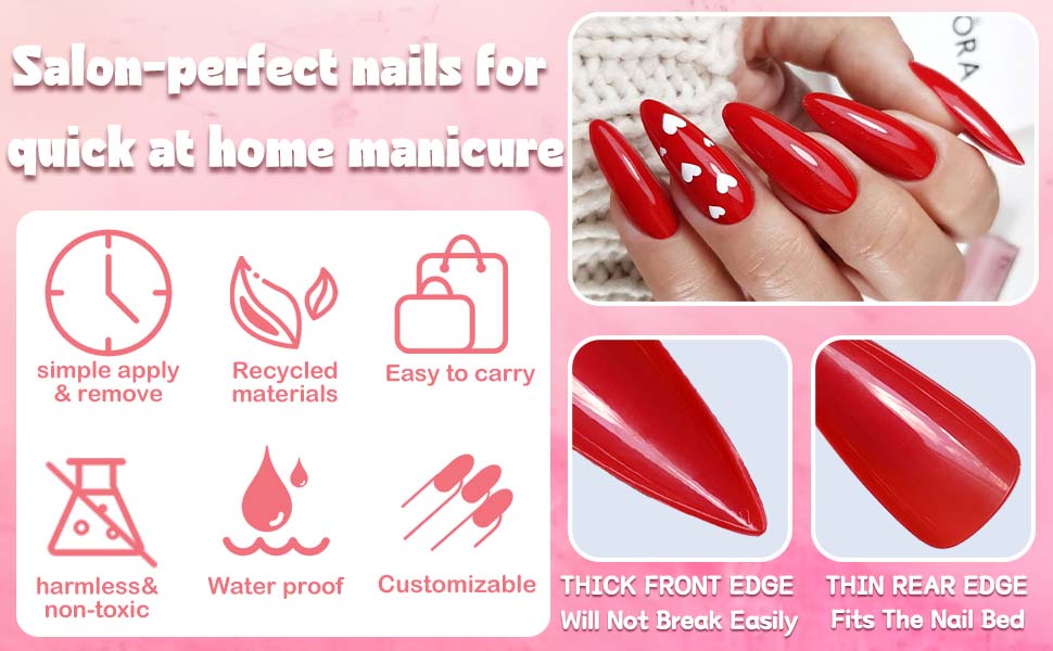 - Time-Saving Press on Nails Acrylic Tips: Full cover press on nails pointy can save you a significant amount of time. You can easily apply long full cover nail tips stiletto at home in just a few minutes. Long press ons stiletto are pre-shaped, so you don't have to spend hours getting your nails done. Long pointed nails press ons are perfect for busy women who don't have the time to go to the salon. Acrylic nails glue on long stiletto are friendly to both nail technician and nail beginner. Long fake press on nails for girls ensure a secure hold that enhances the natural beauty of your nails.