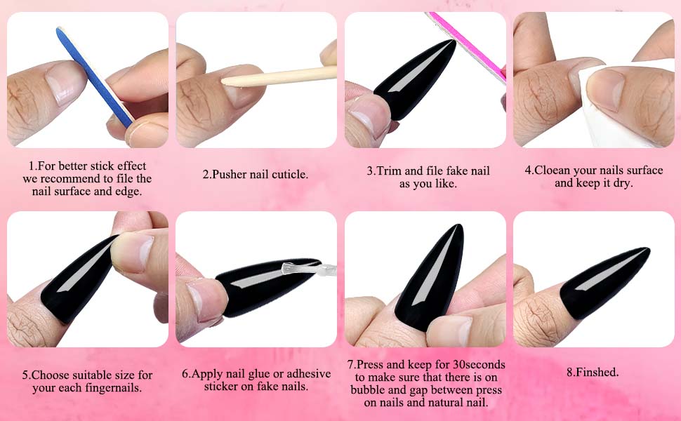 - 24 Colors Long Finger Nails Press ons Stiletto: Long stiletto acrylic nail kit packed in a clear plastic box includes 576pc full cover nails stiletto, 1pc nail file and 10 sheets jelly adhesive tabs. Long length press on nails kit offers 24 colors to choose from. From classic colors like black press on nails, white press on nails, nude press on nails to bold colors like red press on nails, hot pink press on nails, burgundy press on nails, etc, you'll find the perfect match for any outfit or occasion. Stiletto nails glue on long are great for women who want to express their individuality.