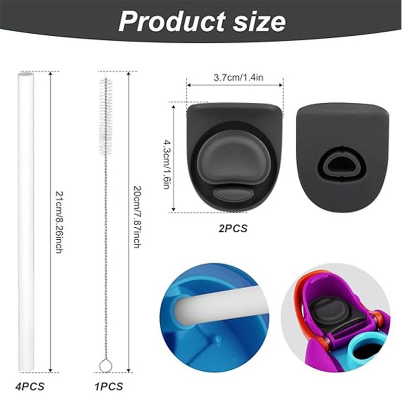 - 2. Leak-Proof Design: Say goodbye to annoying water leakage with our silicone spill-proof stoppers. These pragmatic accessories are designed to perfectly prevent spills, ensuring a mess-free drinking experience. The included straw brush allows for thorough cleaning, reaching every corner of the straw.