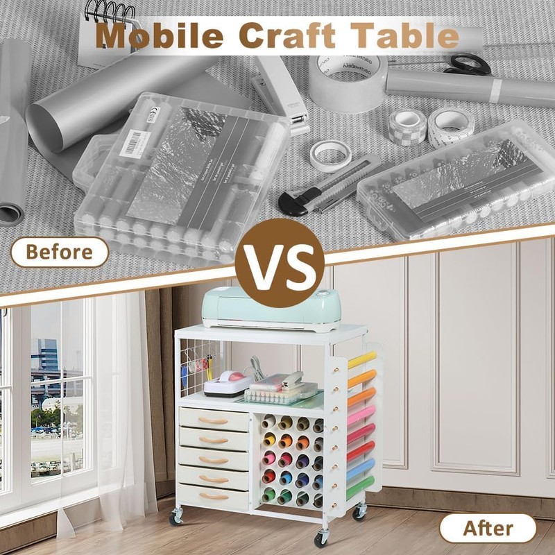 • Large Capacity Storage: The organization and storage craft table equipped with 2 tier shelves, 5 durable fabric drawers, and 28 vinyl roll holders, providing spacious storage space for all your crafting supplies. Keeping them organized and easily accessible