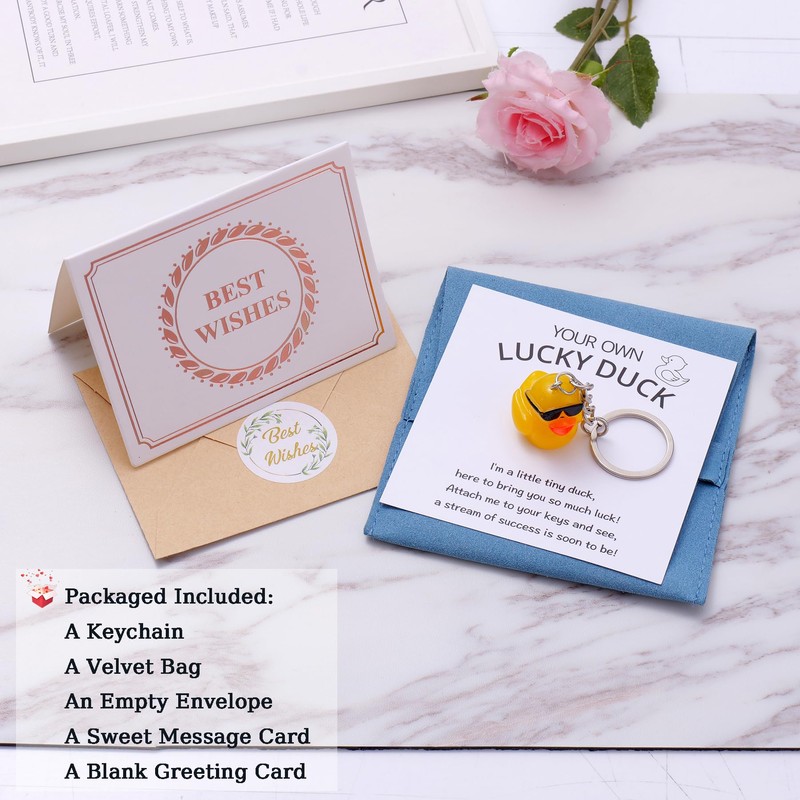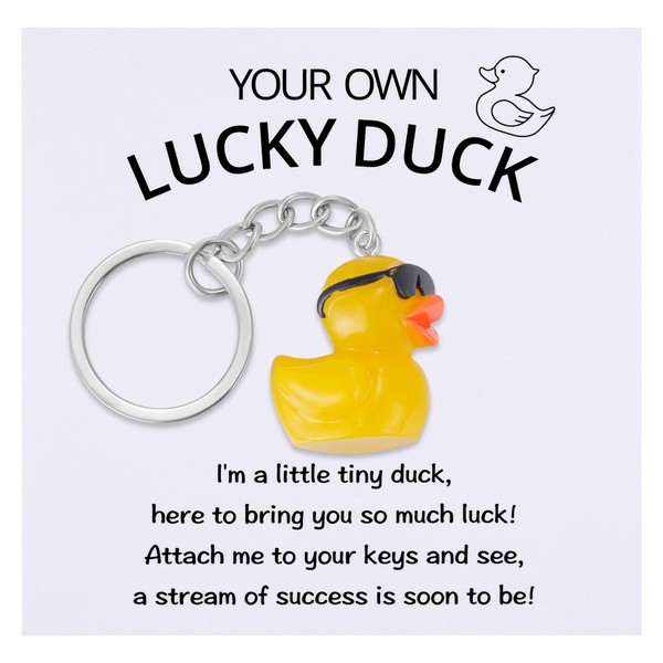 - Adorable Lucky Duck Keychain -- Each duck keychain comes with a beautifully designed gift card that featuring a heartfelt poem: "I'm a little tiny duck, here to bring you so much luck! Attach me to your keys and see, a stream of success is soon to be!" This unique little gift is perfect for a friend starting a new chapter, a colleague needing a pep talk, or a student facing exams. A meaningful show of support and an inspiring keepsake.