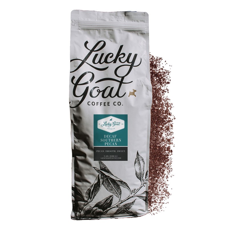 Lucky Goat Flavored Decaf Southern Pecan Coffee – 5 Pounds Bulk Ground - 5lb Bag - Natural Water Process, Nutty & Sweet, Low Acid, Smooth Body, Medium Roast, Gluten Free, Sugar Free, Keto Friendly