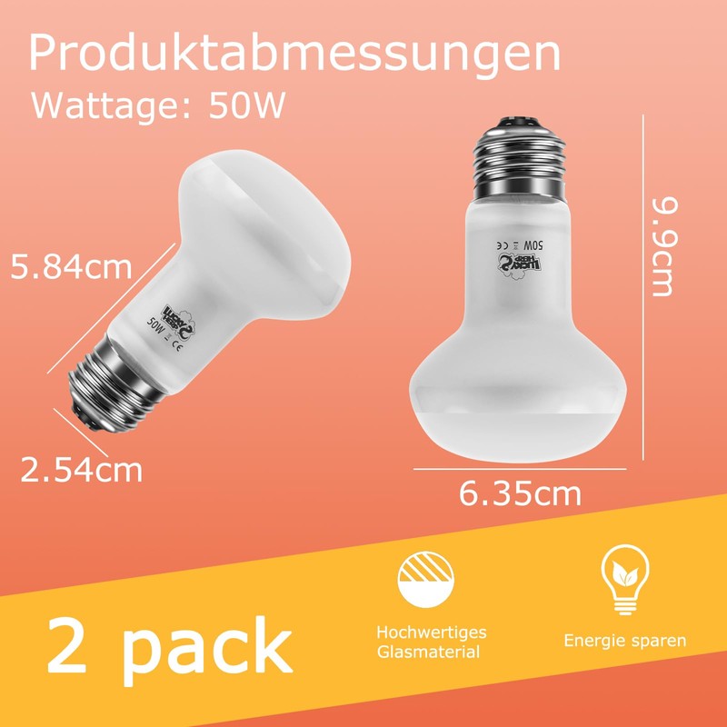 LUCKY HERP Reptile Heat Lamp Terrarium, UVA Lamp Turtle 50 W, Pack of 2, Heating Lamp Terrarium Lamp for Turtles, Chickens, Dogs, Bearded Dragons and Other Reptiles and Amphibians