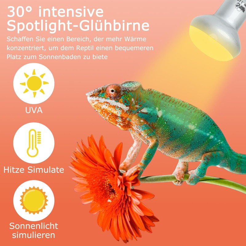 - Perfect light and warmth - Terrarium reptile heat lamp provides the reptile with sufficient UVA light and heat at the same time, regulates the physiological function of the reptile and improves the overall activity level. Promotes appetite, digestion and metabolism of reptiles.