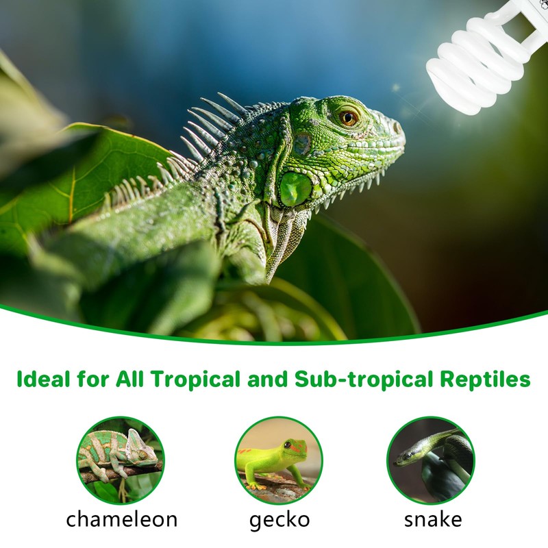 5% UVB and 30% UVA ray output is ideal for tropical and subtropical reptiles or amphibians including lizards, tortoises, chameleons, etc. Energy saving and long lasting, is your pet's best choice.