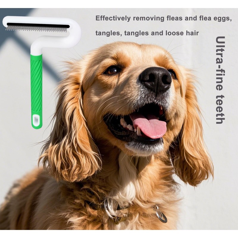Lucky Interests Flea Comb, Stainless Steel Shedding Brush with Rounded Teeth, Multifunctional Pet Grooming Brush with Rubber Handle, T Shaped Tick Comb, Grooming Brush for Remove Anti Fleas Eggs,Green