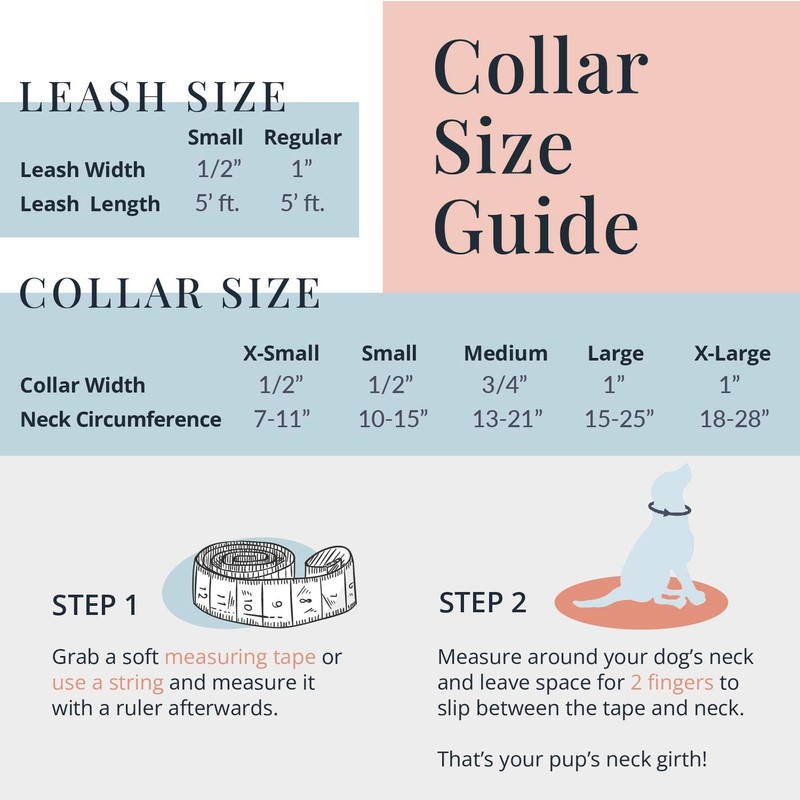 - LOOKING FOR A MATCHING COLLAR+LEASH SET TO USE ON WALKS? We’ve got you covered. And you’re going to love the bright, colorful options! Our beautiful collars have matching leashes that are perfect for dog walking and hiking. Leashes are 5 feet long, with a comfortable, soft hand loop that keeps you in control of your pooch. Leashes come in two widths and can be purchased separately.