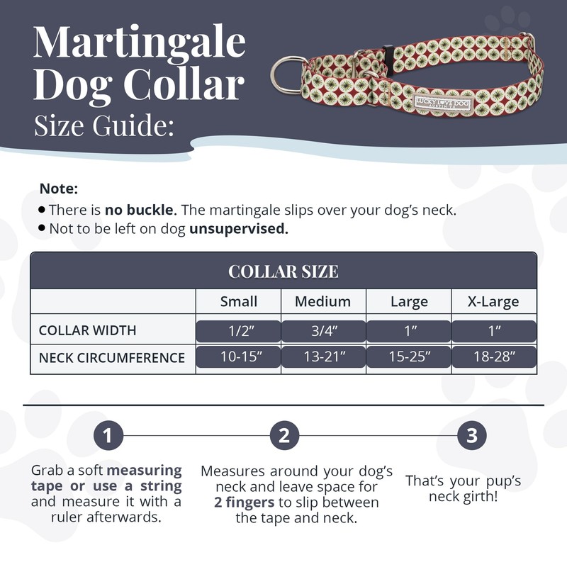 • MEASURE YOUR DOG'S NECK FOR A PERFECT FIT: Before selecting a size, measure your dog's neck for accuracy. Our martingale collars are perfect for small to large sized dogs. It easily slips over your dog's head as THERE IS NO BUCKLE. PLEASE NOTE: It's not to be left on your dog unsupervised. This is for walks only.