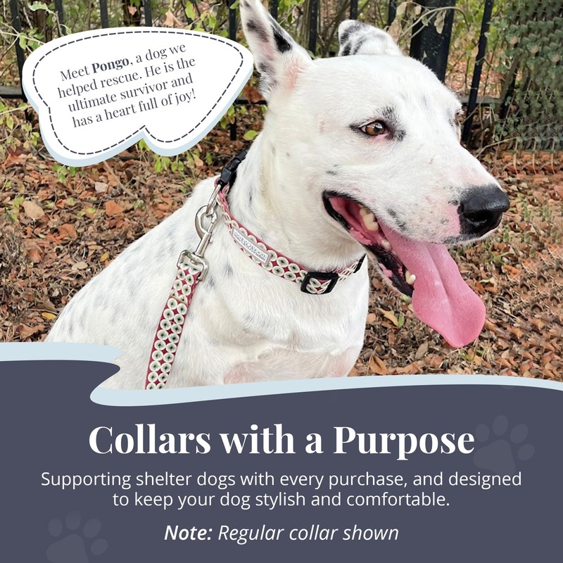 Lucky Love Dog Martingale Collars offer durable, no-slip, comfortable, and adjustable dog collars for small to large dogs. Designed to gently tighten when pulled, they provide better control during walks. These collars do not have buckles and should only be used under supervision. Featuring a burst of happy blooms on a pink and blue background designed by Seattle’s own Jess Phoenix, they are also machine washable. Matching dog leashes are available separately. With every purchase, a portion supports dog rescue efforts, including Pongo, a resilient, three-legged dog rescued from South Texas who inspired the name of this listing. Saving them is our passion. From Texas to Thailand, we’ve been part of countless rescue stories, giving beautiful dogs a second chance at life through human compassion. Your purchase helps shelter dogs find their forever homes.