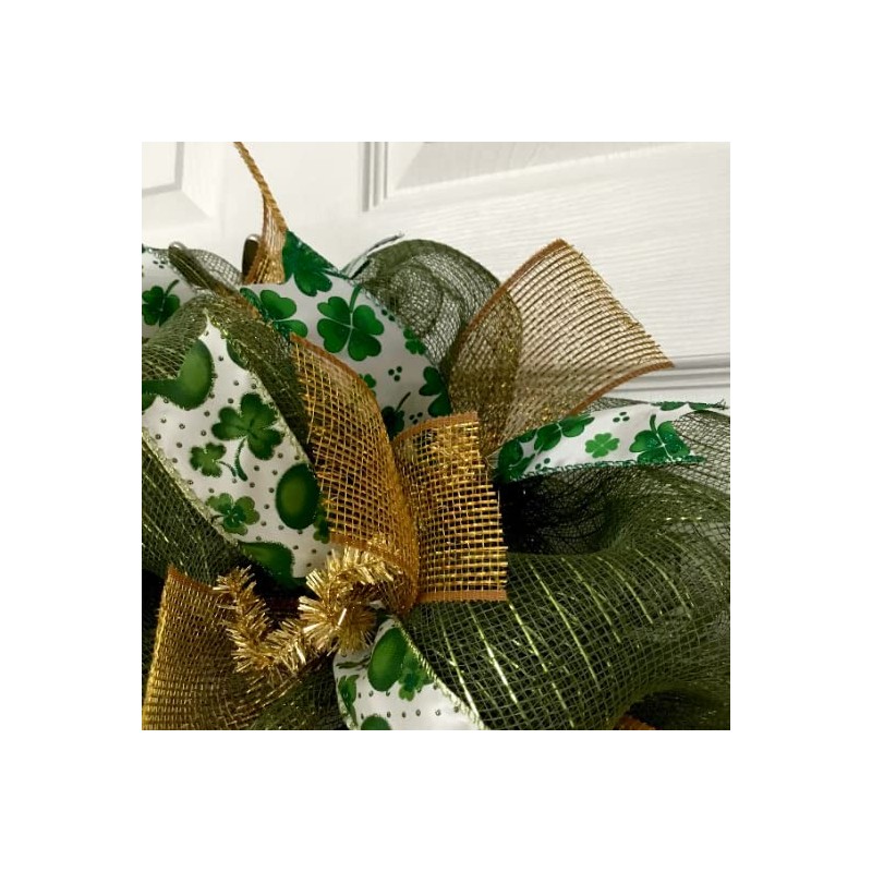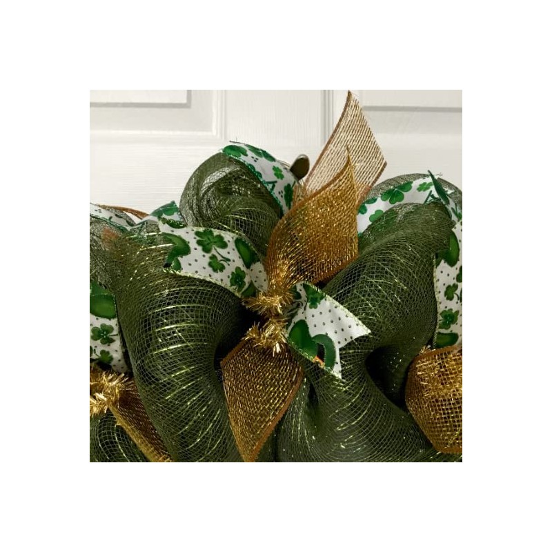 Gorgeous, full, premium St Patrick's Day handmade deco mesh wreath features a beautiful wood plaque which says "Lucky." The plaque rests on a bed of shimmering green deco mesh. The sign has gold letters surrounded by green shamrocks. Gold metallic mesh bows and premium St Patrick’s Day ribbons are placed along the inner and outer rings. The size is 24 inches in diameter and 6 inches deep.