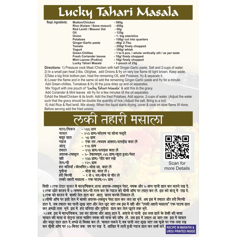 - Lucky Tahari / Pilaf Masala is a blend for meat, rice and lentil delicacies. Gulbarga Tahari, Awadhi Tahari etc. are just a few of the regional ways to prepare Tahari to your own style.
