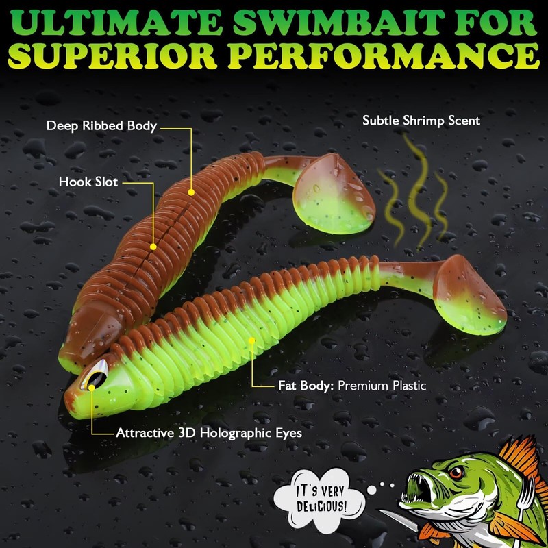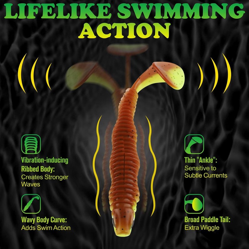 - Lifelike Swimming Action: Paddle tail swimbaits feature a vibration-inducing ribbed body. Grabs water & creates strong vibrations to attract bass. Quickly narrows into a thin "ankle" before the broad paddle tail. Soft plastic lures are sensitive to even subtle currents, delivering a natural, lifelike presentation. Broad paddle tail wiggles with power on fast or slow retrieves. A unique wavy body curve boosts swimming motion & realism. Cast soft bait out, and watch it come to life!