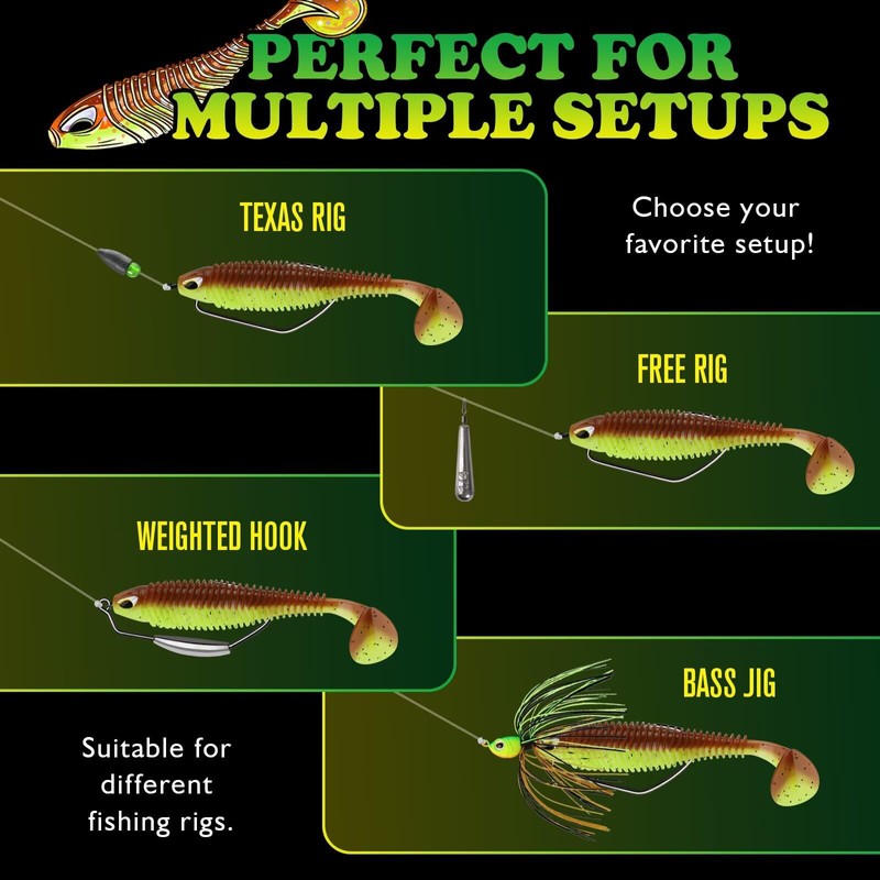 - Ready for Multiple Fish: LUCKYFISHING paddle tail swimbaits are suitable for a variety of setups. Perfect paired with a Texas Rig, Carolina Rig, Free Rig, Weighted Hook, Bass Jig, Spinner Baits, & Buzz Baits. Ideal for saltwater & freshwater! From quiet streams to rocky shorelines. Soft plastic lures are perfect for targeting bass, trout, crappie, panfish, redfish, and more. Try the LUCKYFISHING soft baits on your favorite setups! Ready to put more fish on your boat!