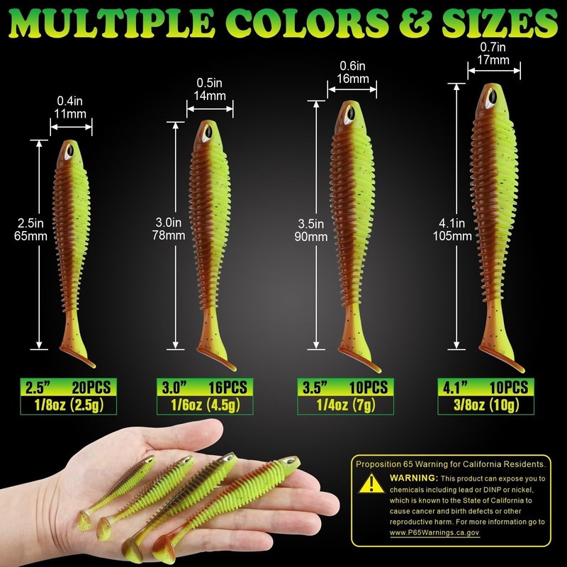 - Best Fishing Gift for Men: Attractive paddle tail swimbaits come in multiple sizes & colors to match any fishing condition. Size-Pcs: 2.5''-20 pcs, 3''-16 pcs, 3.5''-10 pcs & 4.1''-10 pcs. Choose the suitable sizes of soft baits for your target fish. Five color options to choose pearl white, black silver, blue pearl, green pumpkin chartreuse, and purple pearl adapt to clear or muddy water. Soft plastic lures are sure to put a smile on the face of any angler!