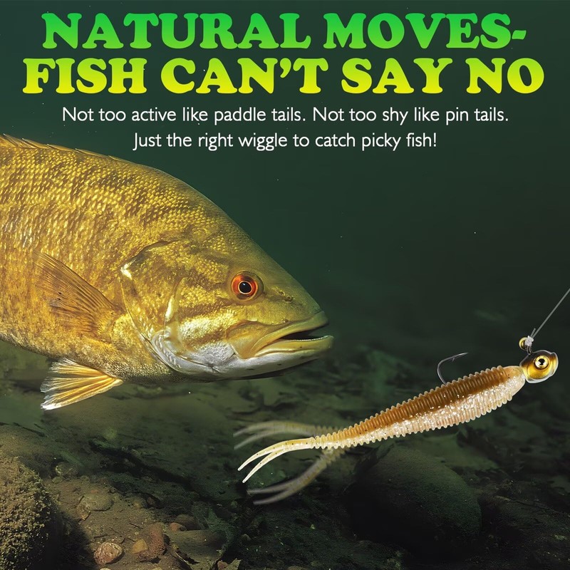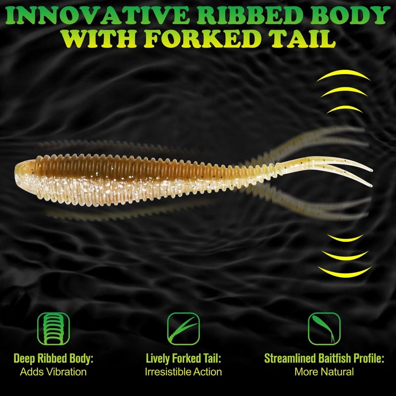 • UNIQUE INNOVATION RIBBED BODAY & FORKED TAIL: Soft Baits are Designed to Swim-Built to Catch. Innovation Deep Ribbed bodies that ripple vibrations through water, creating a tantalizing disturbance that draws fish in from afar. Natural Streamlined Baitfish Profile features a ribbed body design and lively forked tail to create a lifelike action. Slim forked tail adds lifelike motion, expertly mimicking the movements of baitfish while catching attention of even the wariest slabs.